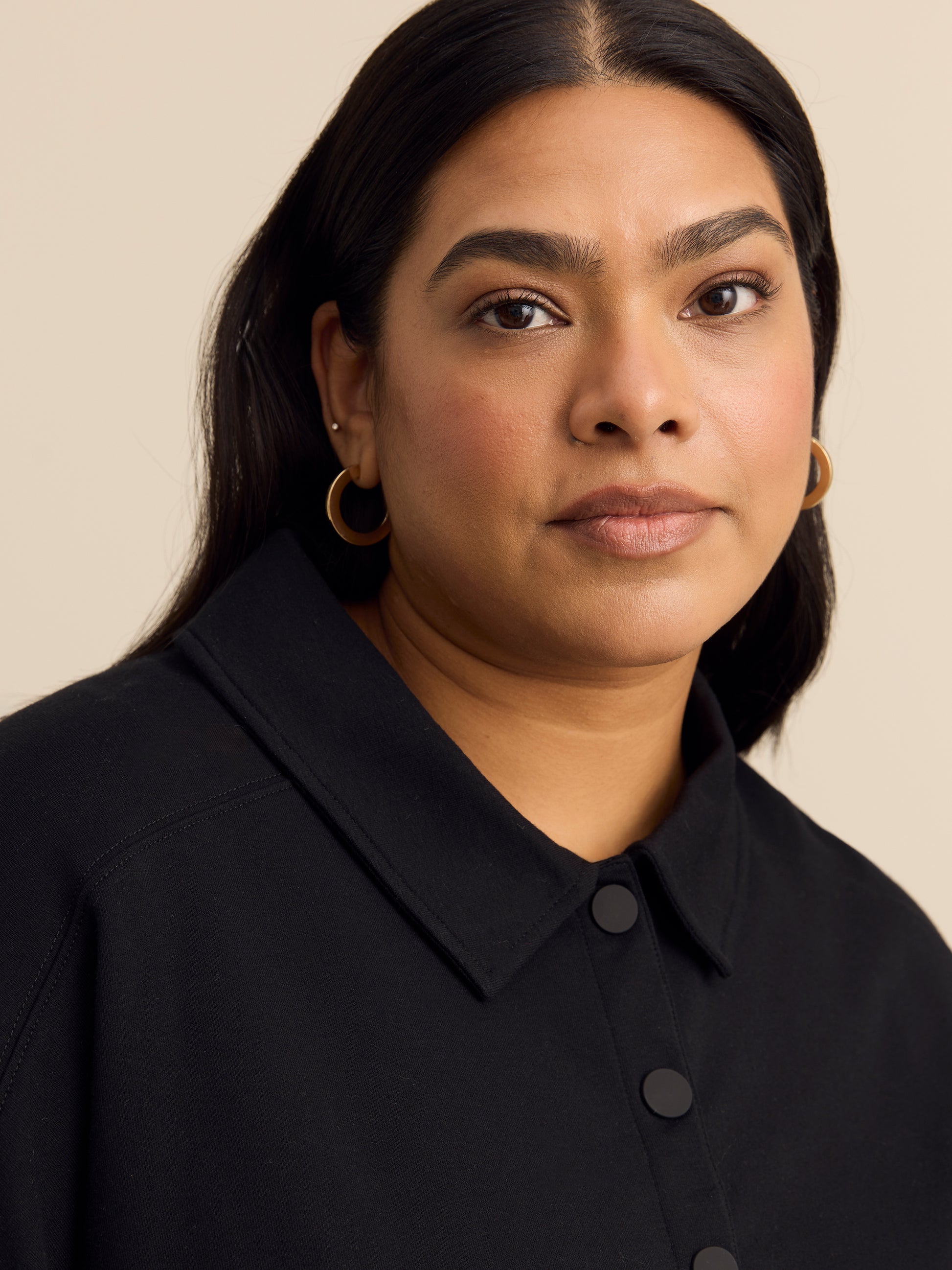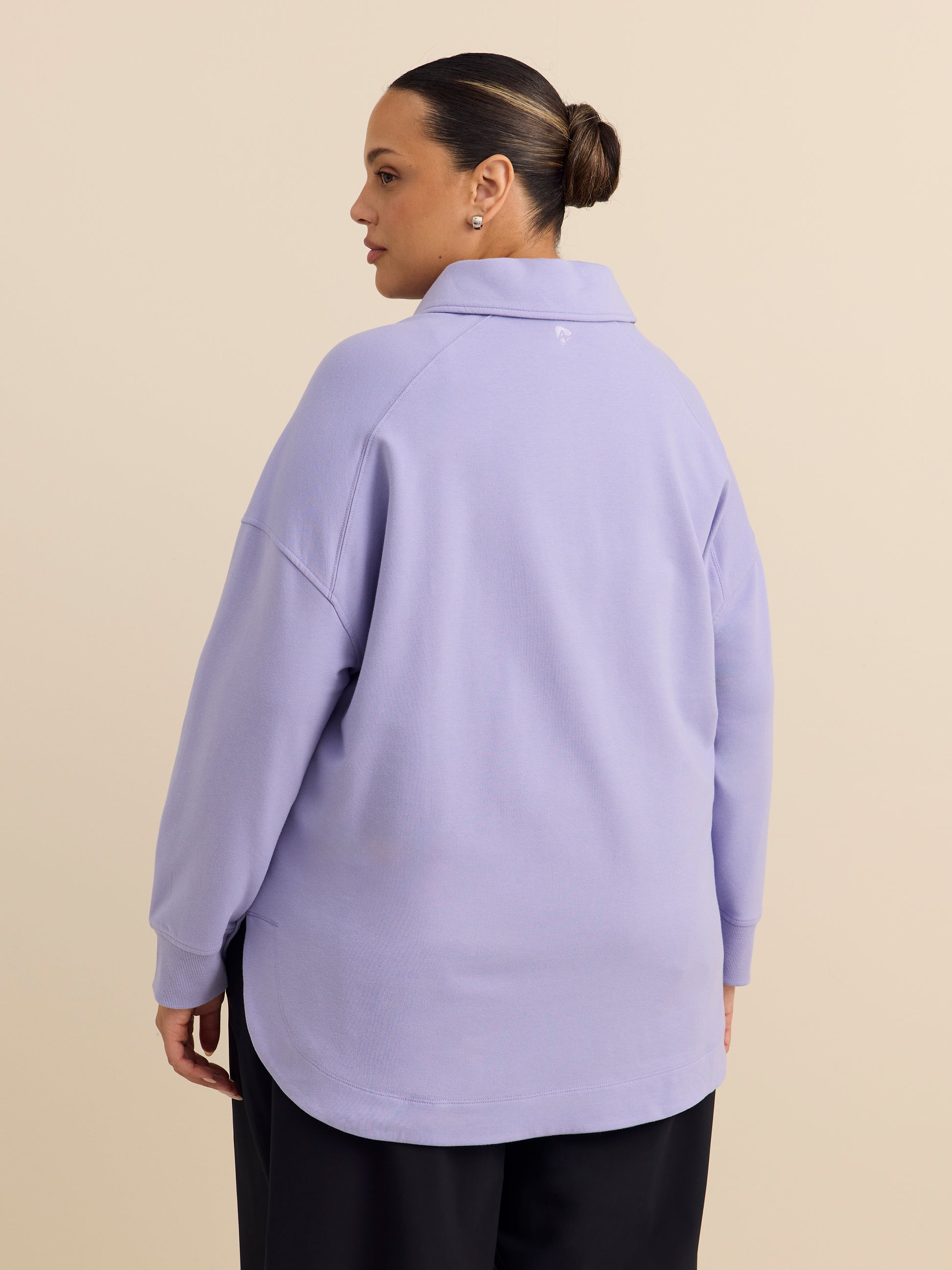 This plus-size sweatshirt with a polo collar brings a fresh twist to everyday comfort with its soft French terry fabric and relaxed pullover fit. Finished with slightly dropped shoulders, balloon sleeves, and a rounded high-low hem, it’s an easygoing style that feels polished without trying too hard.