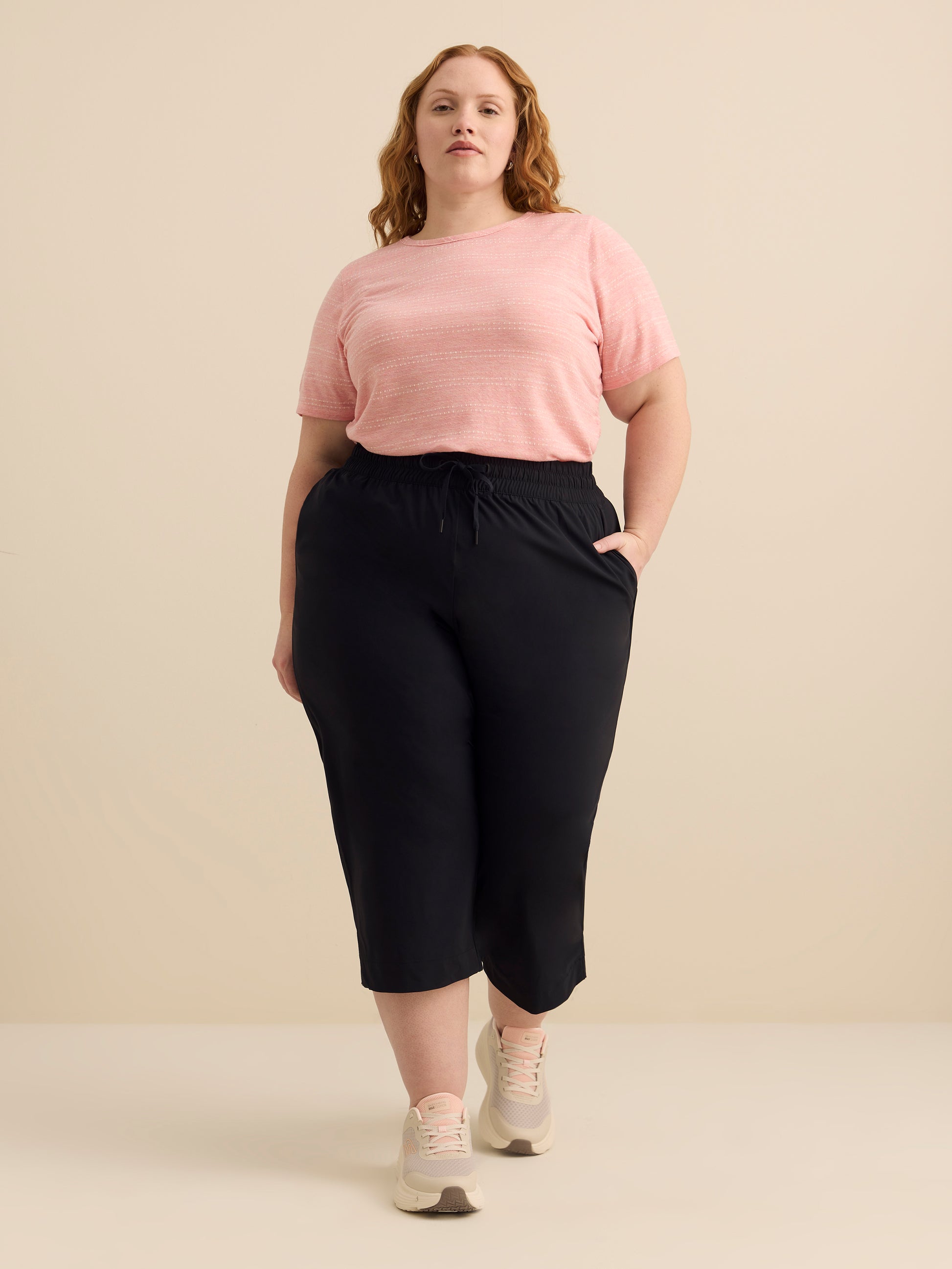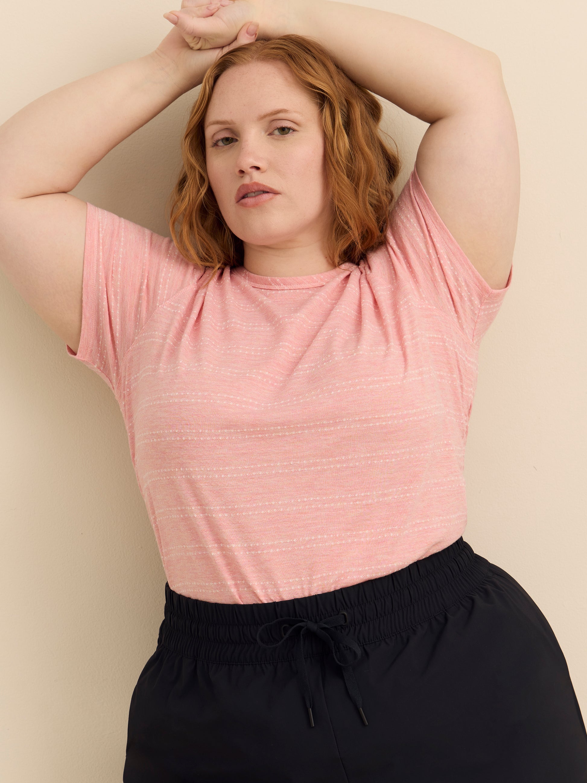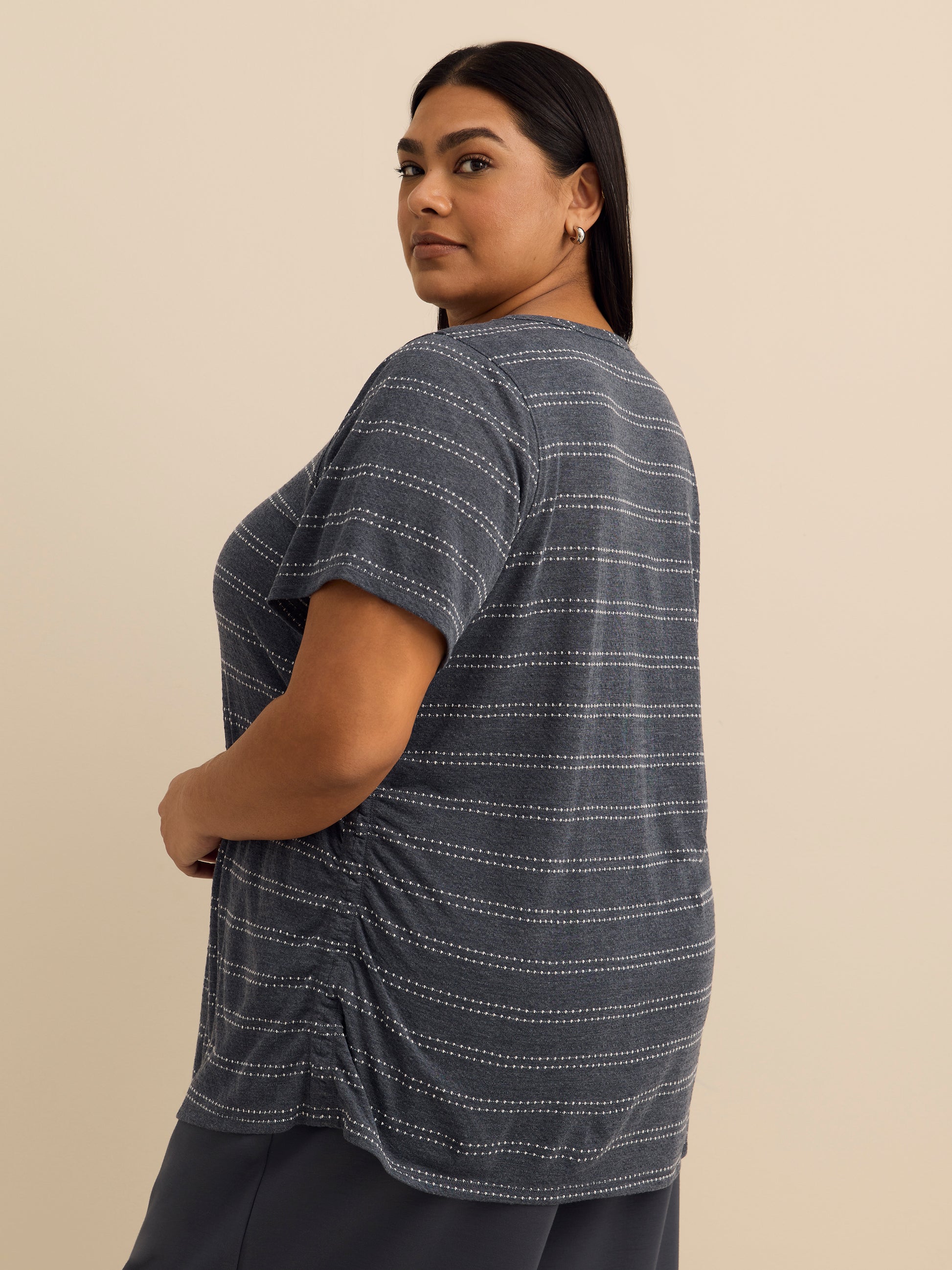 This soft, plus-size t-shirt showcases a subtle dotted stripe pattern. The side elastic shirring detail adds a feminine touch, subtly shaping the silhouette. It pairs effortlessly with high-waisted jeans or a skirt for a relaxed yet polished look.
