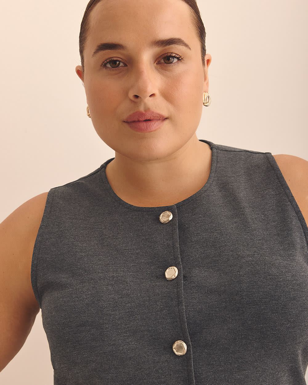Have fun mix-and-matching this plus-size vest! Perfect with matching dressy pants for a professional look or with a casual denim skirt for a trendy style that is sure to stand out. Features - Knit finish - Solid colour - Sleeveless - Crew neckline - Buttoned-down front - Straight fit - Length: 28 in