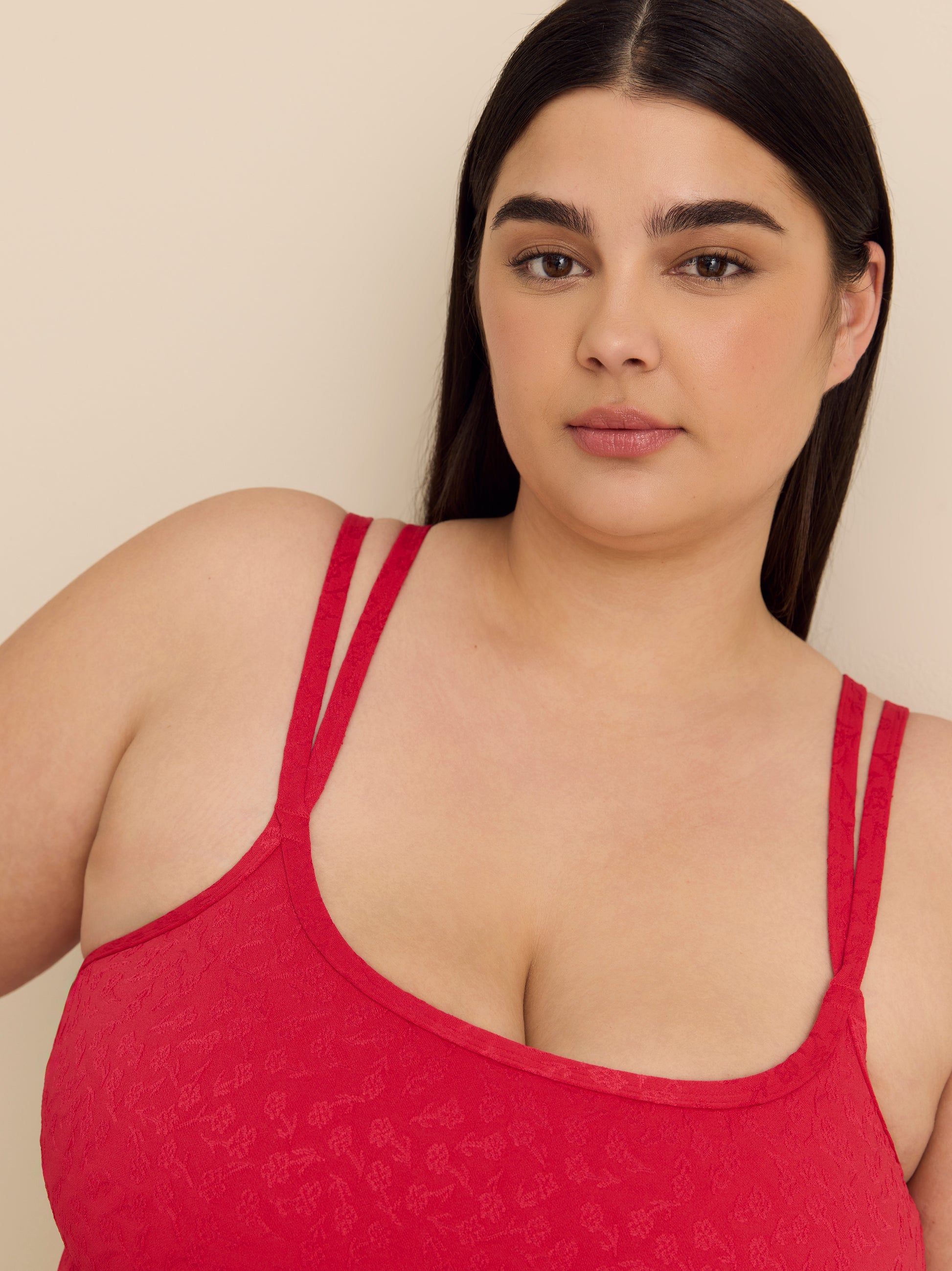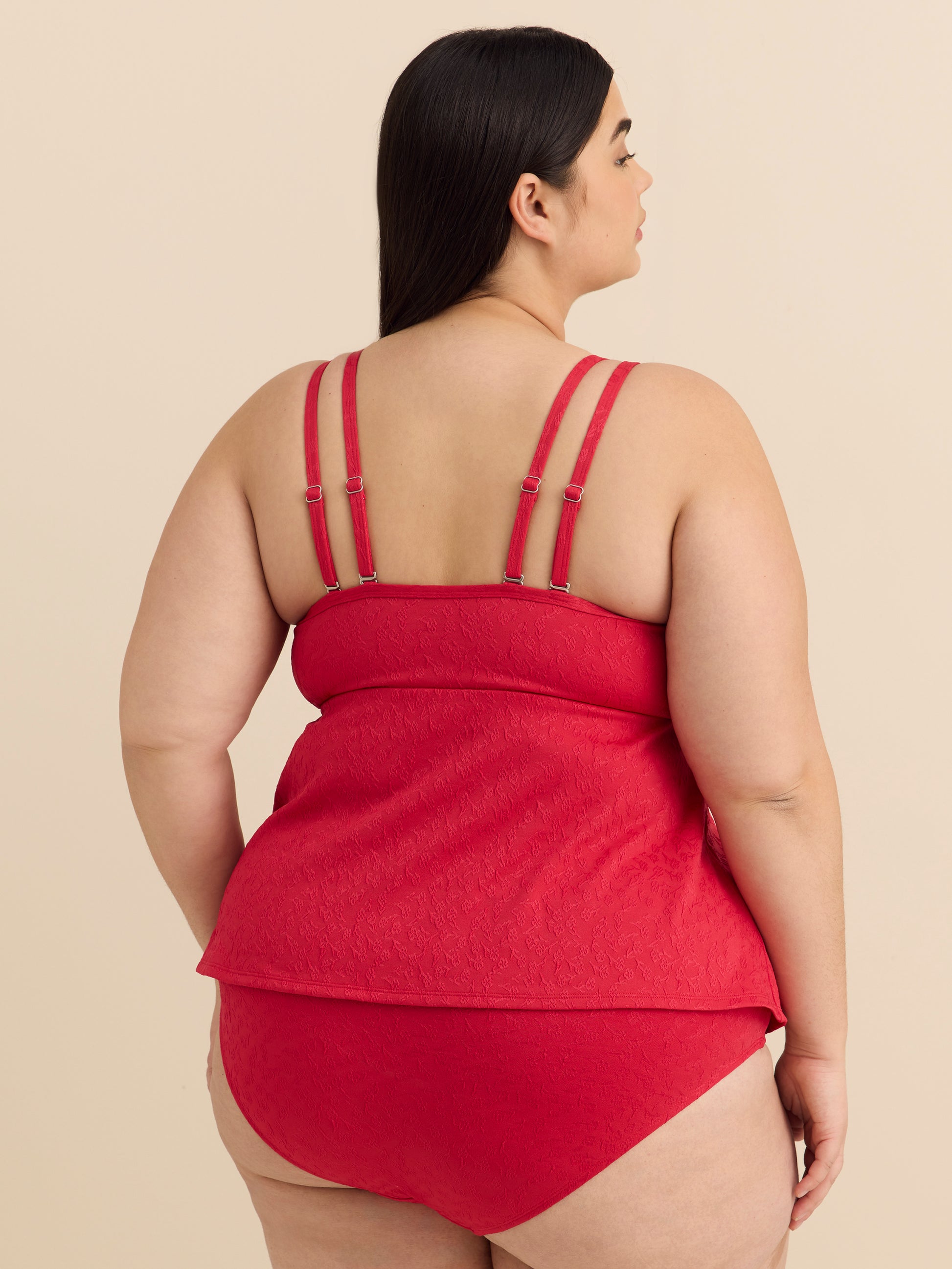 Perfect for sunny days, this plus-size floral jacquard tankini top features a flattering A-line silhouette, an empire waist, and adjustable double straps for comfortable wear.