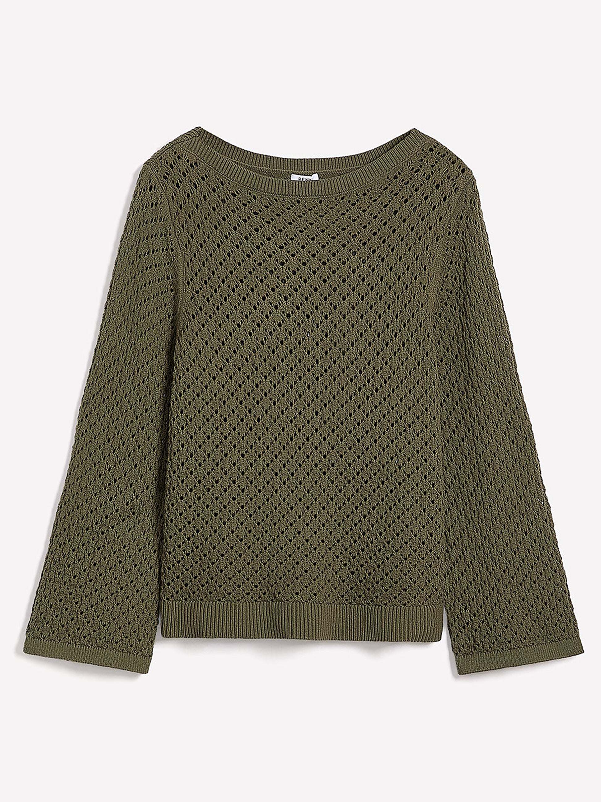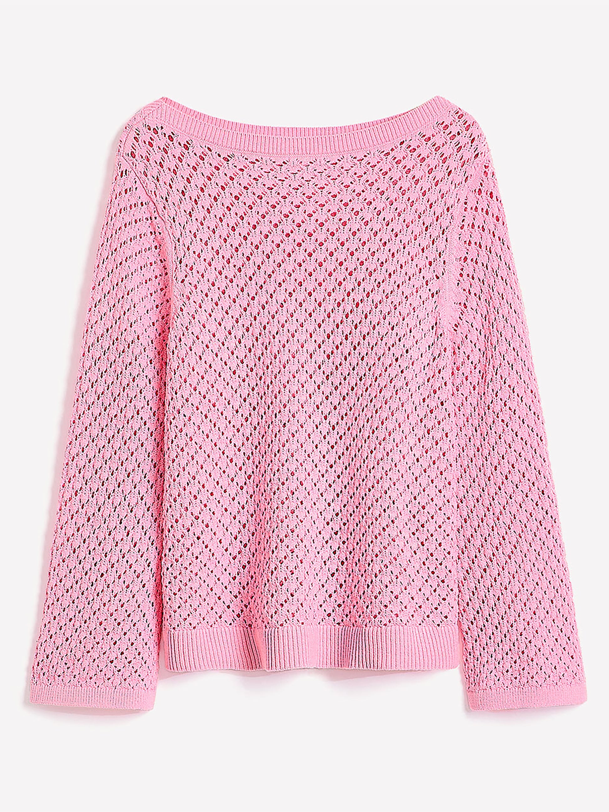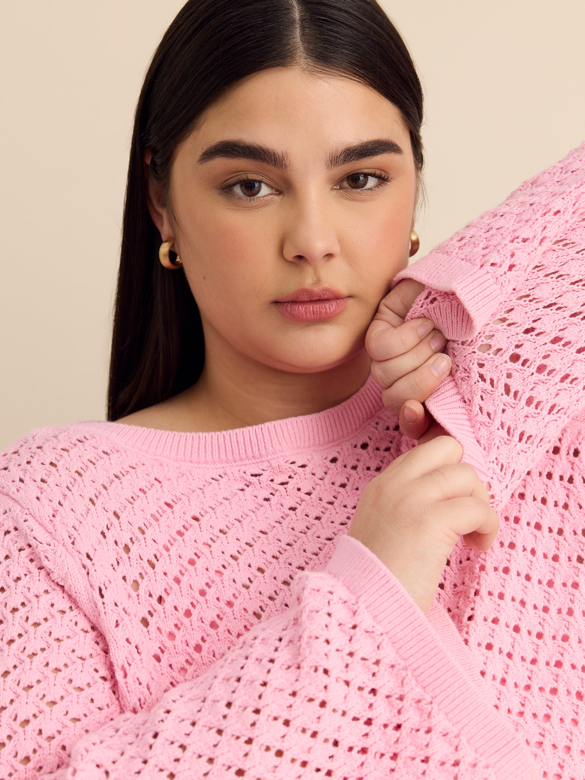 Make your days at home cozier with this feminine plus-size boat neck sweater. Lovely details such as long bell sleeves and fancy stitching make this sweater a great pick for a versatile wardrobe. Wear it with leggings and your favourite pair of jeans!