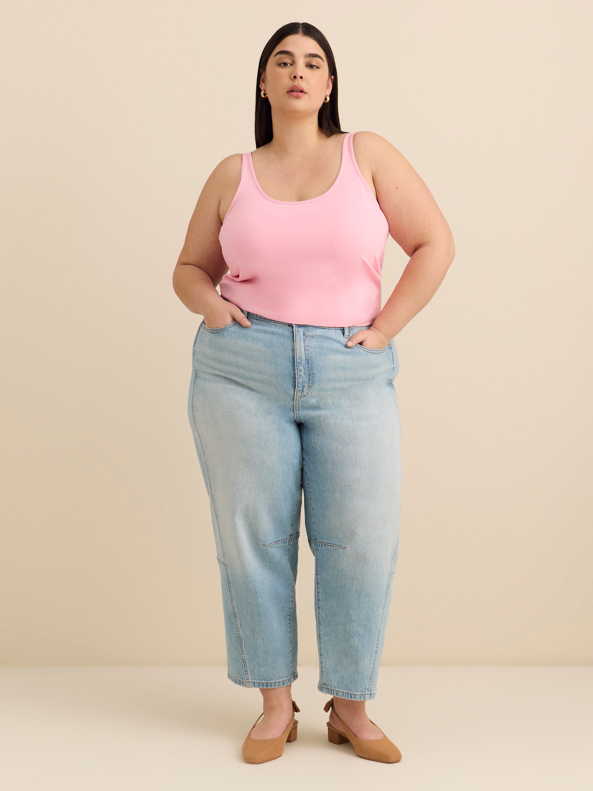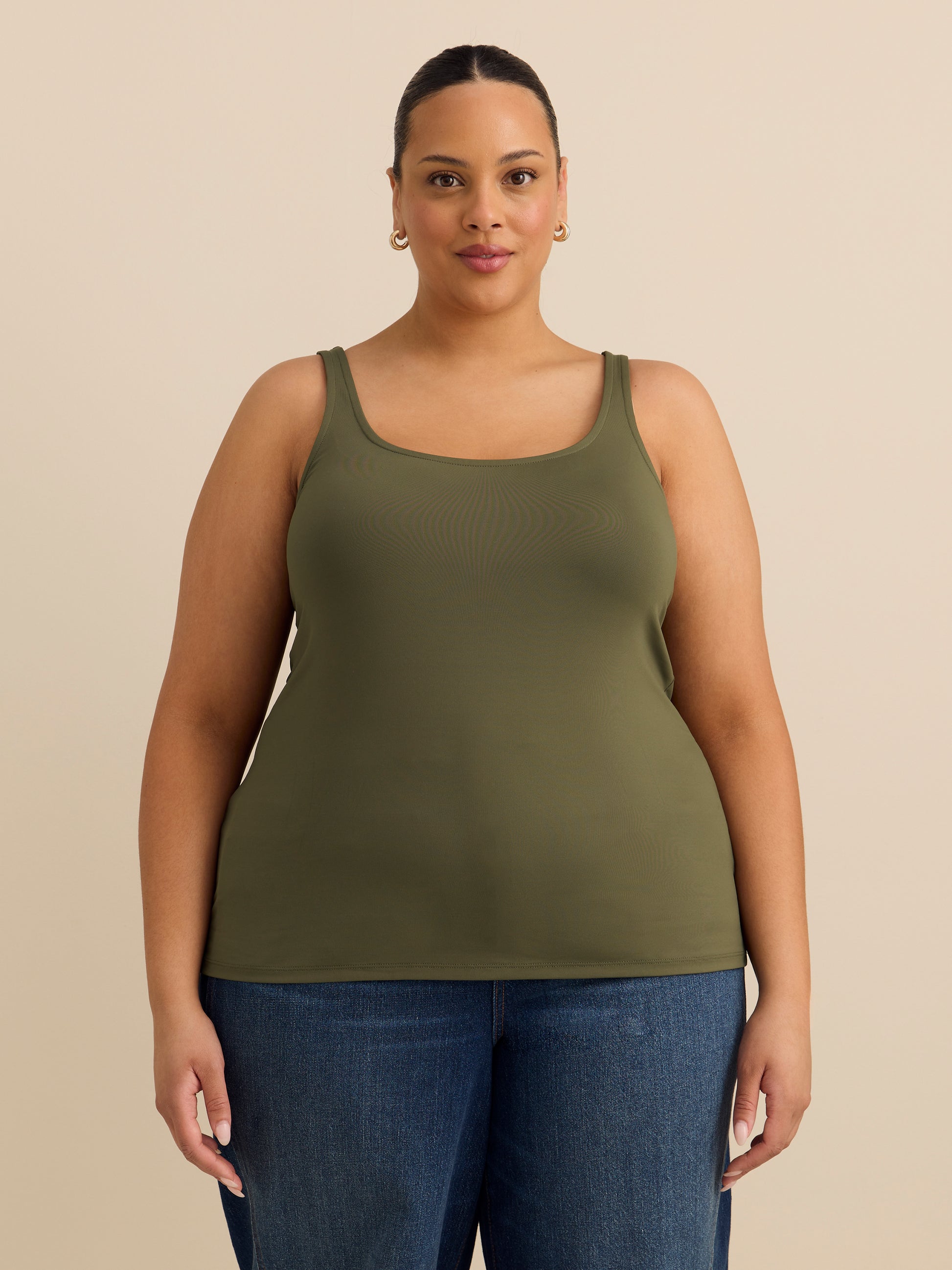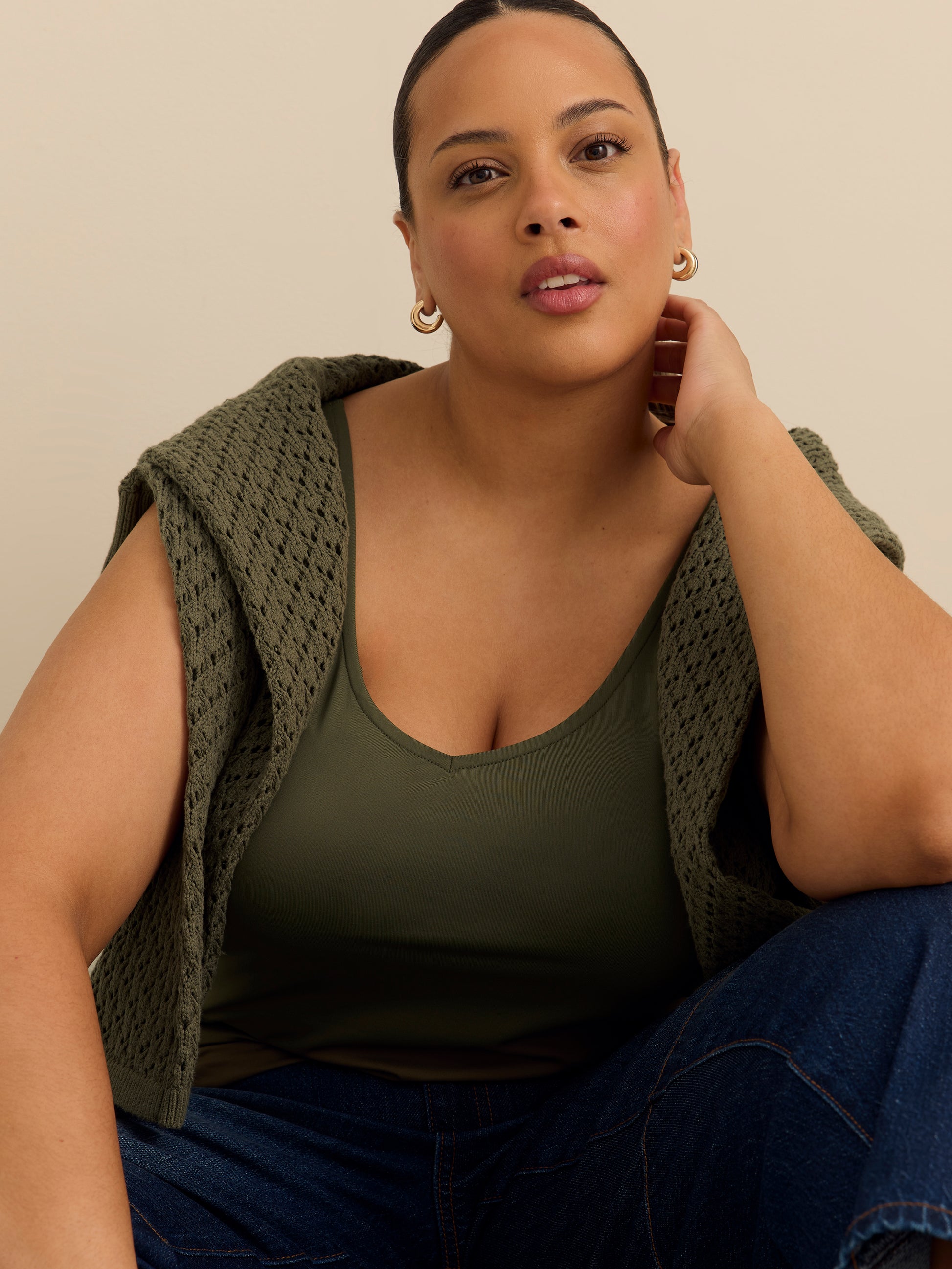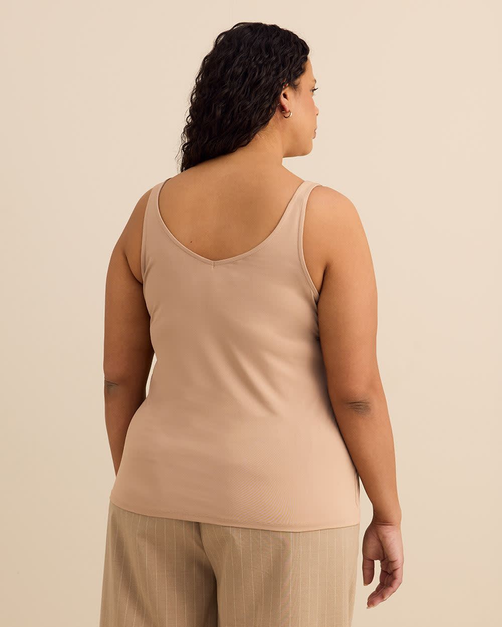 With this casual and comfy plus size tank top in your wardrobe, the possibilities are endless! Thanks to its reversible design, it can be worn with the U-neck or V-neck in the front. Perfect for going from work to an outing with friends in a cinch!