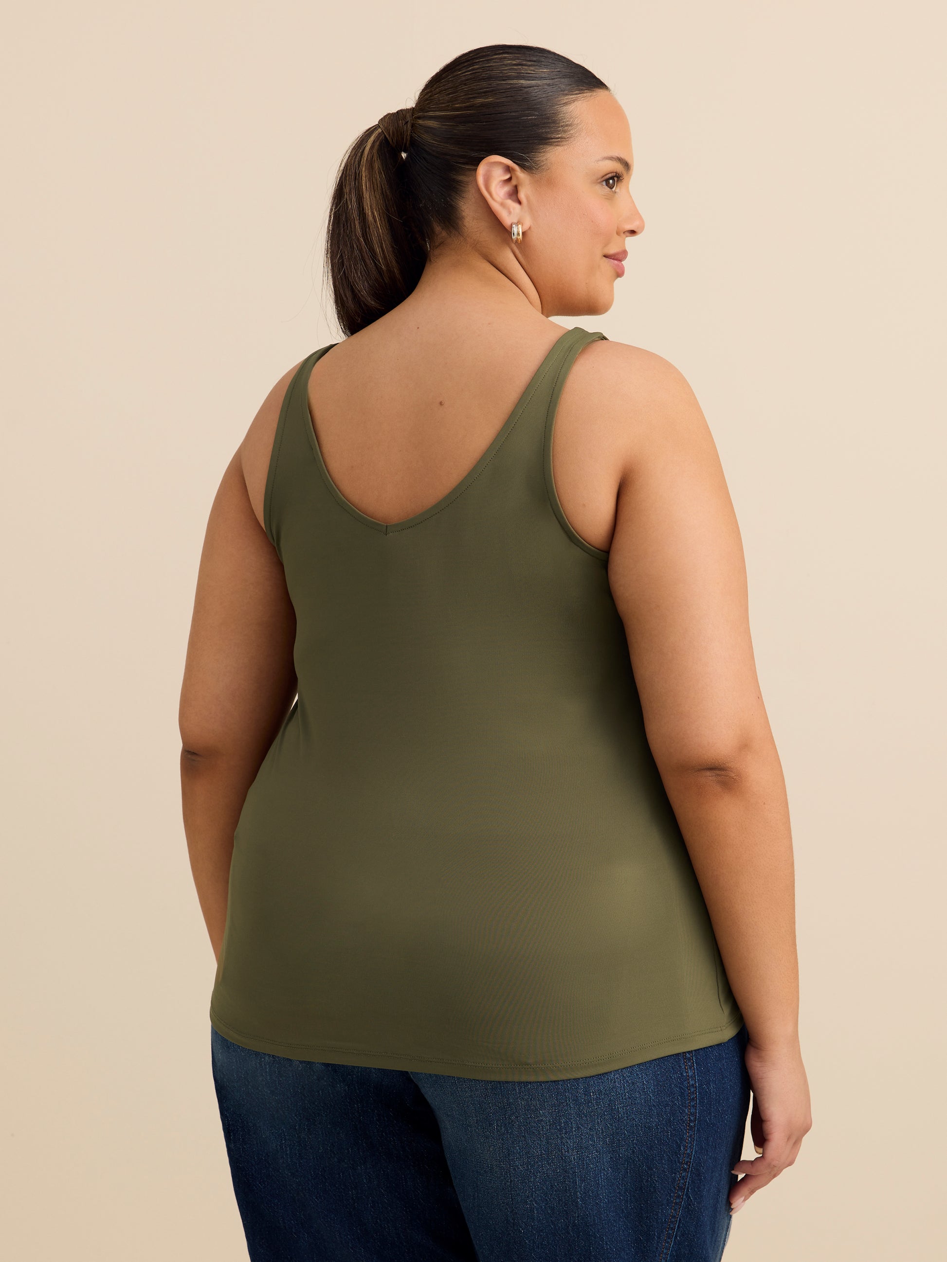 Features - Scooped front, V-neck back - Sleeveless - Bodycon fit - Reversible design - Regular length: 26.5 in.